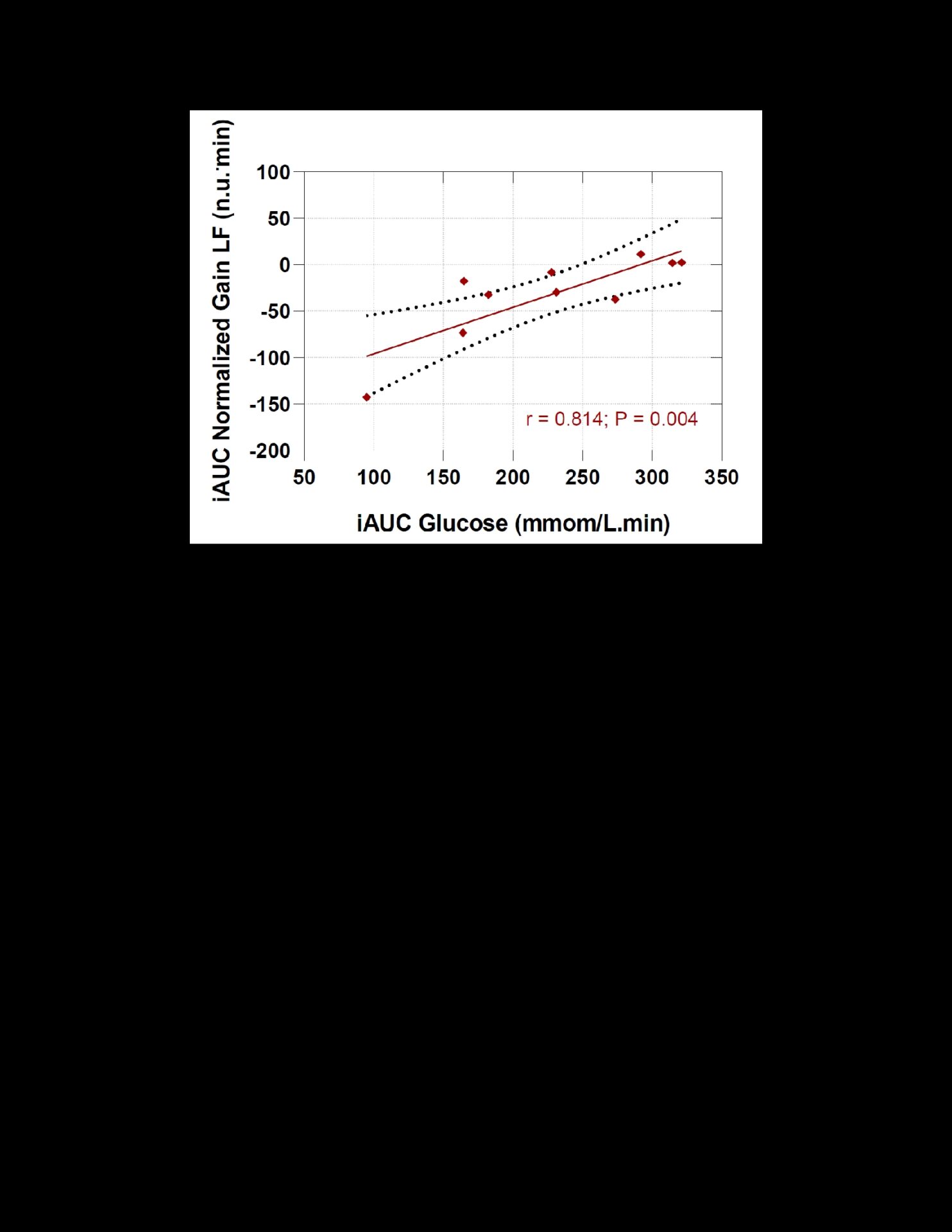 Results: Blood glucose levels increased within the normal range during 2-hour OGTT (iAUC: 227±75 mmol/L·min). Increases in glucose levels during OGTT were accompanied by elevations in mean ABP (baseline = 98±4 vs 120min = 108±6 mmHg, P = 0.002) and ABP variability (baseline = 3.59±0.78 vs 7.20±2.19 mmHg², 120min, P =0.039), confirming that acute hyperglycemia impairs systemic ABP regulation. Despite these changes, there were no detrimental alterations in CBF mean levels, variability or dCA, suggesting that in healthy young adults, cerebral autoregulatory mechanisms maintain stable CBF under hyperglycaemic conditions. However, post-hoc exploratory analyses indicated a trend toward impaired CBF regulation in individuals exhibiting the largest hyperglycaemic responses (r = 0.814, P = 0.004) (Fig.1), suggesting that cerebrovascular control during OGTT-induced acute hyperglycaemia may be altered in individuals with impaired glucose metabolism.