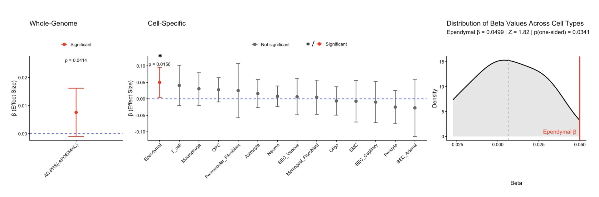 The whole-genome AD-PRS (excluding APOE/MHC regions) was positively associated with CP volume (β=0.0076,SE=0.004,p=0.041, Figure1,left), indicating that global AD-PRS contributes to variation in CP structure. Among cell-specific PRS, ependymal cell AD-PRS showed a robust, highly specific positive association with CP volume (β=0.0499,SE=0.0231,p=0.016, Figure1,center). This association was empirically larger than all other cell-type-specific PRS (Z=1.62,p=0.034, Figure1,right).