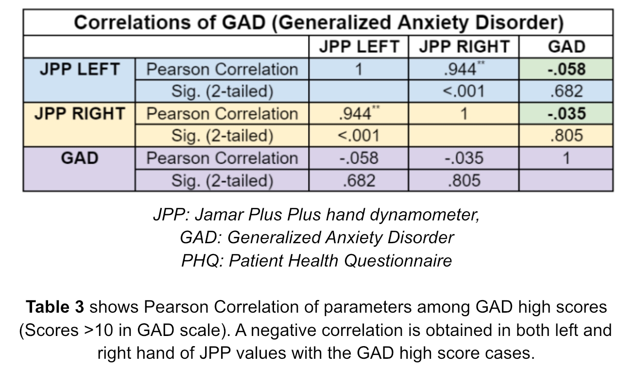 A statistically significant negative correlation was found between HGS and both GAD-7 and PHQ-9 scores (p < 0.05), indicating that participants with higher grip strength had lower anxiety and depression levels. This association was more pronounced in females than in males.