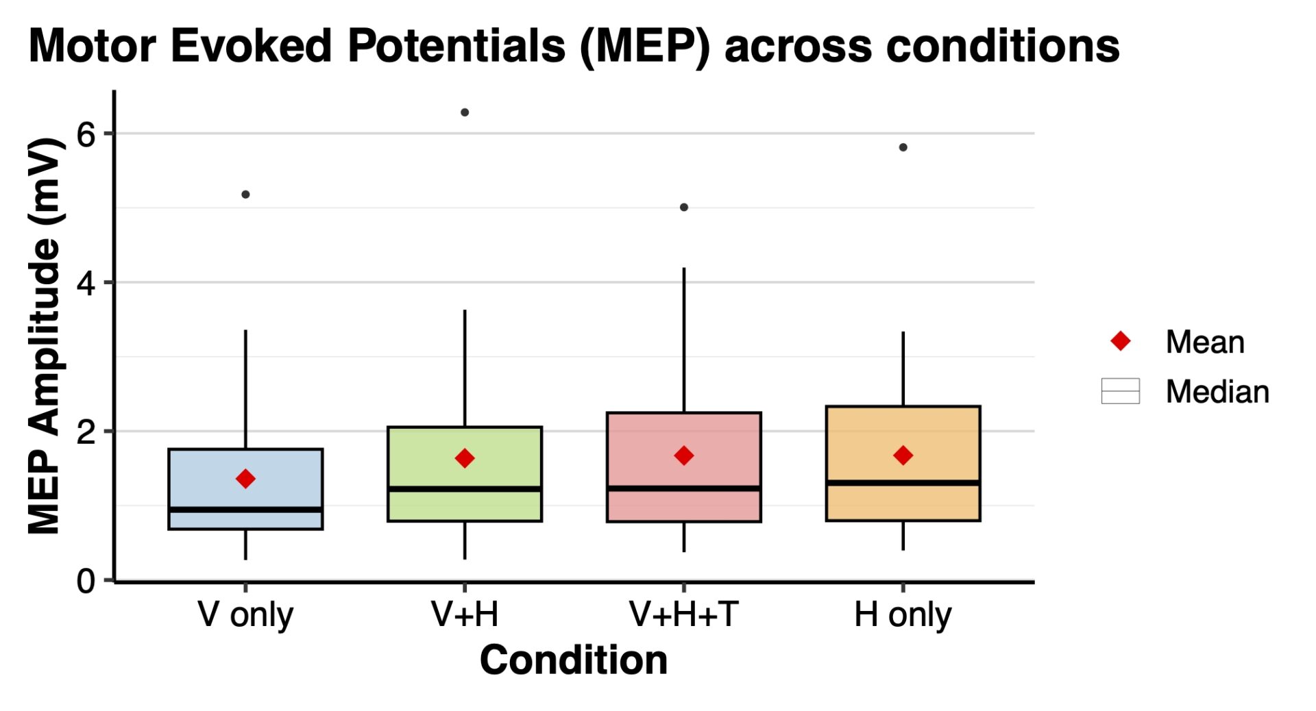 We found a significant main effect of sensory feedback on MEP amplitudes (chi2(3)=22.48, p<0.001), suggesting that CSE is differentially modulated depending on the sensory modalities involved in object contact. Post hoc analyses revealed that the ‘vision only’ condition elicited significantly lower CSE compared to the other three conditions (all p<0.001, see figure). These results suggest that CSE is lower when hand-object contact is perceived exclusively through visual input, compared to conditions where any type of haptic feedback is present, irrespective of whether it is combined with visual information. We found no effect of sensory modality on muscle activity RMS (chi2(3)=4.02, p=0.259), ruling out any low-level effect of background muscle activity on CSE.