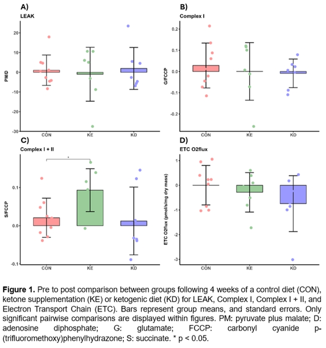Methods: Currently, 33 individuals (age 45±12 years; 24 females, BMI 30.0±3.6) have been randomised to 4 weeks of either a control (n = 12, habitual diet), ketone supplementation (n = 11, thrice daily alongside habitual diet) or ketogenic diet (n = 10) condition (all prescribed at energy balance), with 23 having completed their respective interventions. Baseline measurements (e.g., body mass, body composition via dual energy x-ray absorptiometry, PAEE) and mitochondrial respiration in the adipose tissue were assessed before and after the intervention. Mitochondrial bioenergetics were established by measuring through high-resolution respirometry (Oxygraph-2k, Oroboros Instruments, Innsbruck, Austria) by following a substrate-uncoupler-inhibitor titration (SUIT) protocol SUIT-008 DL (DIG-1PM-2D-2c-3G-4S-5U-6Rot-7Ama). The protocol consisted of adding specific substrates related to each mitochondrial complex (e.g., succinate for Complex II) to investigate its contribution to the electron transport chain (ETC). Change from baseline to follow-up were compared between groups with a one-way ANOVA.