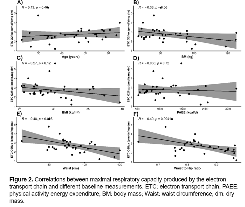 Results: There were no significant differences between groups in relation to LEAK (p > 0.05, Fig-1A), Complex I (p > 0.05, Fig-1B) and ETC (p > 0.05, Fig-1D). However, there was a significant difference in Complex I+II linked respiration between the control group and ketone supplementation group (p < 0.05, Fig-1C). Significant negative correlation was found between the total release of energy by the electron transport chain in the adipose tissue and waist circumference (R = -0.48, p = 0.005, Fig-2E) and waist to hip ratio (R = -0.49, p = 0.004, Fig-2F). No other significant correlations were found among baseline measurements.