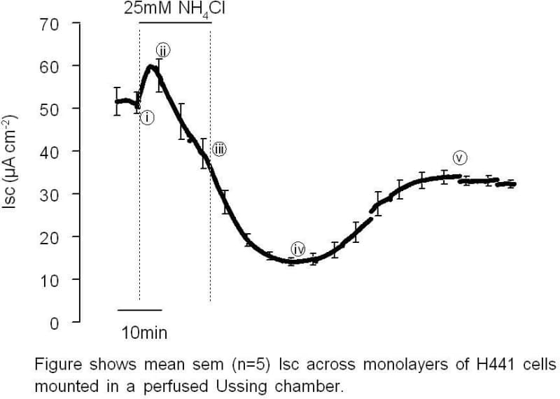 Changes in pHin have long been known to alter the rate of Na+ transport across Na+-transporting tight epithelia (1, 3). The aim of this current study was to investigate the effect of changes in pHin on Na+ absorption across H441 cells, a Na+ absorbing human airway epithelial cell line. Cells were grown to confluence on Snapwell filters (Costar) and mounted in Ussing chambers (1cm2 exposed surface area, chamber volume 1-1.5ml). The apical and basolateral chambers were then continuously perfused with HCO3– -buffered Krebs solution (37°C, ~1ml min-1). Cells were maintained under open circuit conditions until transepithelial potential difference (PD) had stabilised (15-30min). Mean PD, short circuit current (Isc) and transepithelial resistance (Rt) under those conditions were 16.6±2.8mV, 54.5±6.0μAcm-2 and 292±22Ωcm2 respectively (n=6). Transepithelial PD was then clamped at 0mV using a voltage clamp and the current required to maintain this PD (Isc) was continually monitored and recorded to computer disk. Ammonium chloride (25mM) was added to both sides of the epithelium to alkalinise pHin and this induced an initial rise in Isc (i-ii in Figure). Isc then began to fall, presumably as pHin began to acidify (ii-iii), before subsequent removal of NH4Cl, which acidifies the cells, induced a large inhibition of Isc (iii-iv). Isc then slowly recovered (iv-v), presumably as the cellular pHin regulatory mechanisms returned pHin to normal levels. Addition of apical amiloride (10μM) inhibited this effect of changing pHin on Isc, suggesting that the effects are mediated by a change in Na+ transport. Addition of 5-(N-Ethyl-N-isopropyl) amiloride (EIPA; 100μM), a Na+/H+ exchange inhibitor, had no effect on either the initial rise in Isc or the subsequent fall but did block the recovery of Isc towards the basal level (iv-v). Presumably it inhibited the recovery of pHin from acidosis and thus the Isc remained depressed. In summary, alkalinisation stimulates Na+ absorption across H441 airway epithelial cells, whilst acidification inhibits Na+ transport. These results show that in common with Na+ transport across tight epithelia (1-3) Na+ absorption in airway epithelia is acutely dependent on pHin.