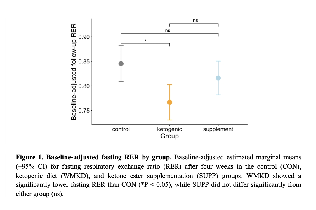 Aims and objectives: This interim analysis examined 1) fasting substrate oxidation and 2) metabolic flexibility, measured as FQ – RER, after a 4-week controlled weight-maintaining ketogenic diet (WMKD), ketone ester supplementation (SUPP), or habitual control diet (CON) in overweight and obese adults.