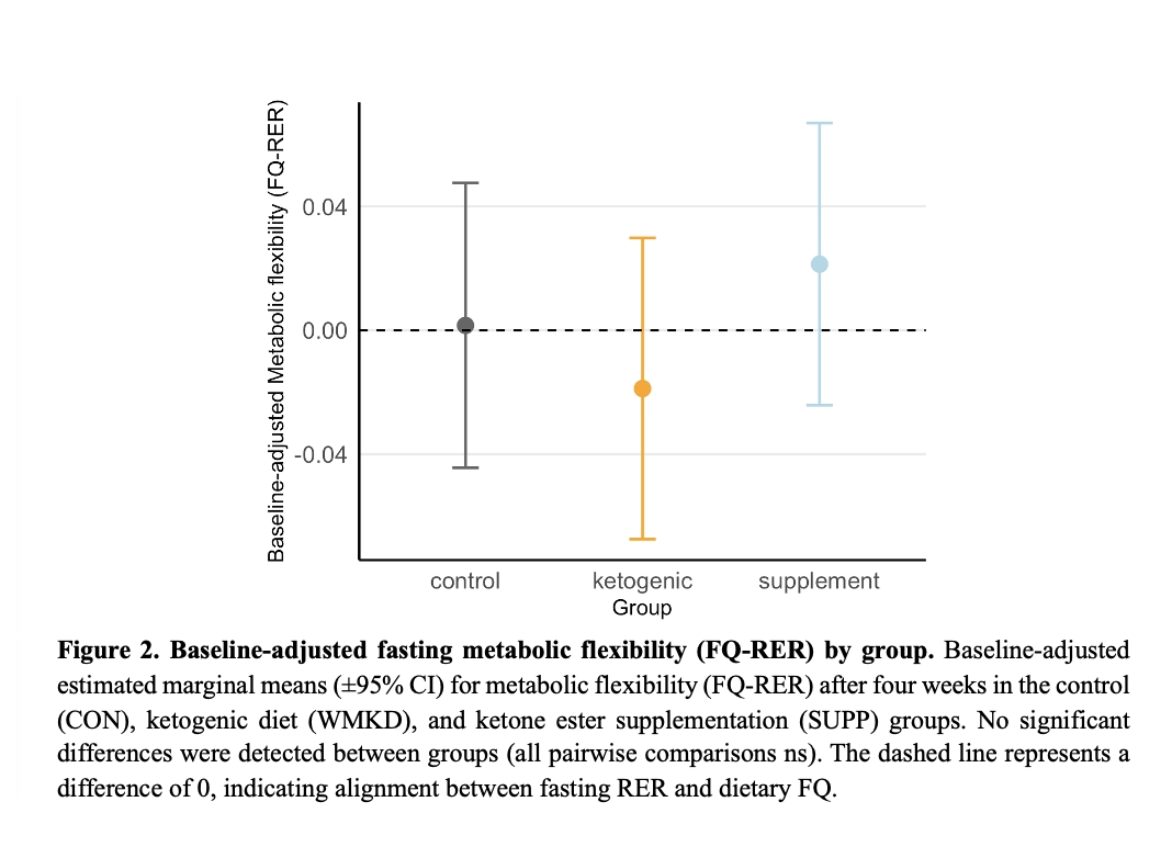 Four weeks of a weight-maintaining ketogenic diet, but not ketone ester supplementation, reduced fasting substrate utilisation. No differences in baseline-adjusted FQ – RER were observed between groups. Incorporating postprandial RER measurements in future work may help identify more dynamic changes in metabolic flexibility.