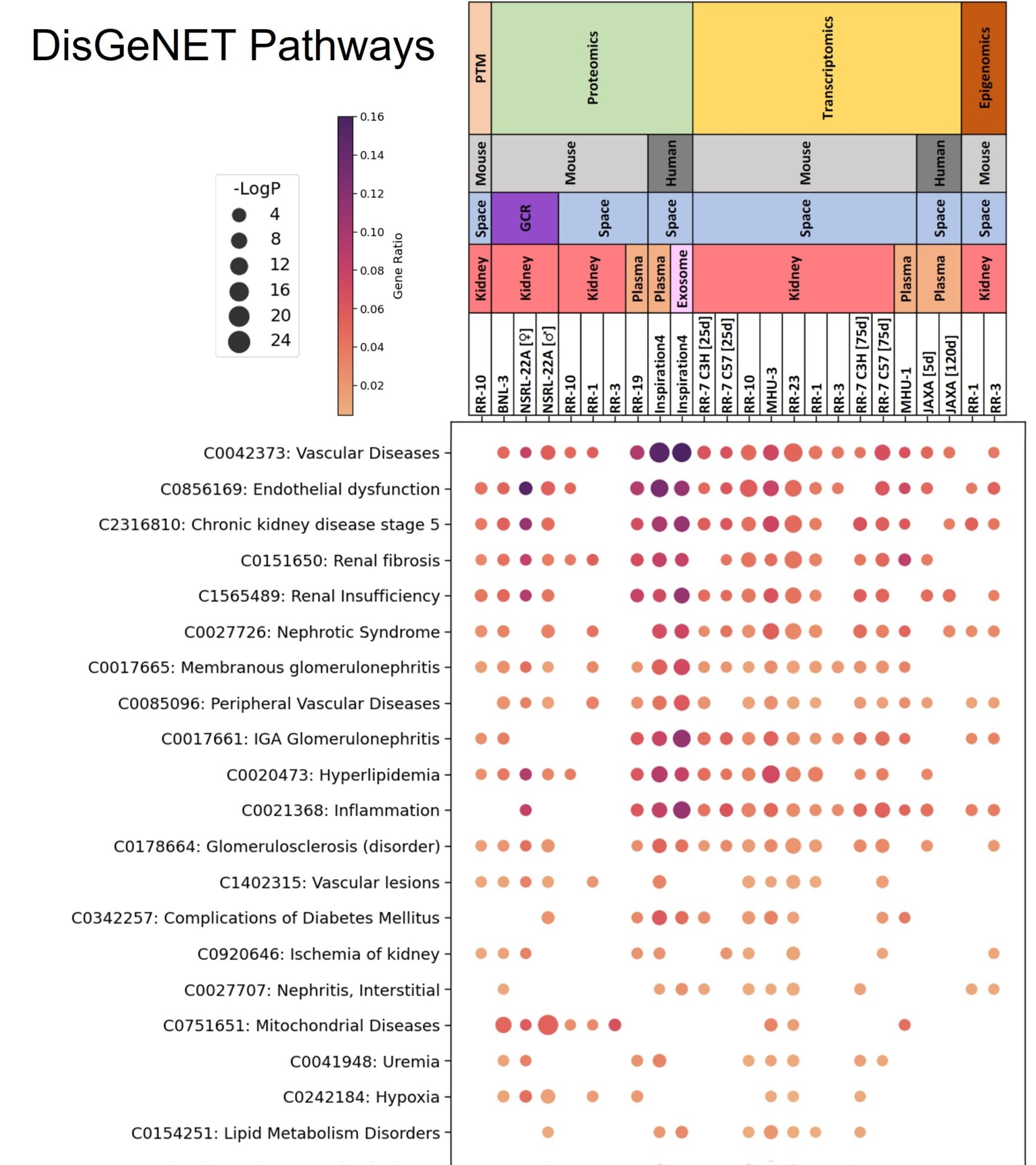 Pathway analysis of human and mouse plasma and kidney samples showed enrichment of gene products associated with renal fibrosis, inflammation, glomerular and tubular injury (Fig.1). GCR-exposed animals had decreased mitochondrial protein expression, and elevation in pathogenic miRNA species. Spatial transcriptomics revealed immune cell infiltration of the cortex, biochemistry revealed elevated urinary protein loss and histopathological investigation revealed incidences of thrombotic microangiopathy.