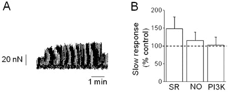 We find that the slow response observed in single rat myocytes stretched by carbon fibres does not depend on activation of PtdIns-3-OH kinase, generation of NO, or a functional sarcoplasmic reticulum. We have previously shown that the stretch-activated channel plays a major role in the slow response observed in cells stretched by carbon fibres (Calaghan & White, 2002). The present data contrast with those of Vila-Petroff et al. (2001) who proposed the RyR as the final effector underlying the slow response. The method by which cells are stretched may have profound consequences for the activation of intracellular signalling cascades, perhaps depending on the extracellular connections/support of the cell.
