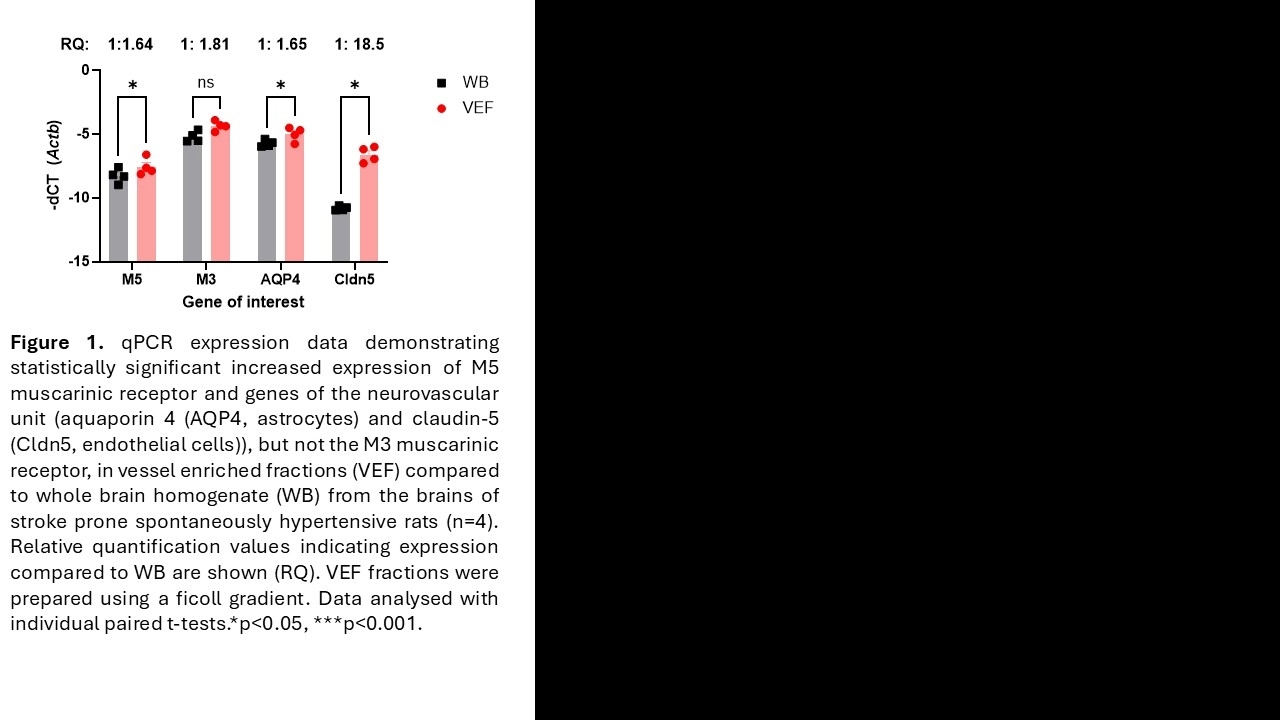 Whole brain (WB) homogenates from stroke prone spontaneously hypertensive rats (SHRSP), underwent a vessel enrichment protocol using a ficoll gradient. Cerebral and peripheral vessels were also dissected from SHRSP, namely the middle cerebral artery, basilar, transcending aorta, carotid and mesenteric arteries. RNA was isolated from WB homogenates, vessel enriched fractions (S1) and individual vessels. qPCR used to determine the expression levels of M5 & M3 muscarinic receptors along with claudin-5 tight junction protein and aquaporin 4 (AQP4) (expressed predominantly on astrocyte end-feet) relative to the housekeeping gene b-actin. Data was analysed using a paired t-test and p<0.05 was considered statistically significant.