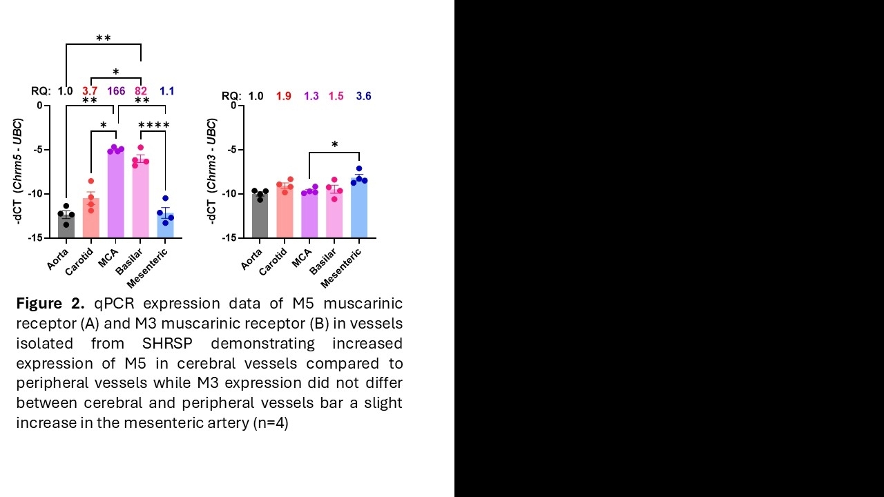 In SHRSP brains, the M5 muscarinic receptor expression is significantly enriched in the cerebrovasculature in both vessel enriched brain fractions and when assessing expression in dissected vessels. This may suggest an important role of M5 in the cerebrovasculature which may provide a potential novel therapeutic target for improving CBF in cerebrovascular disorders and VaD.