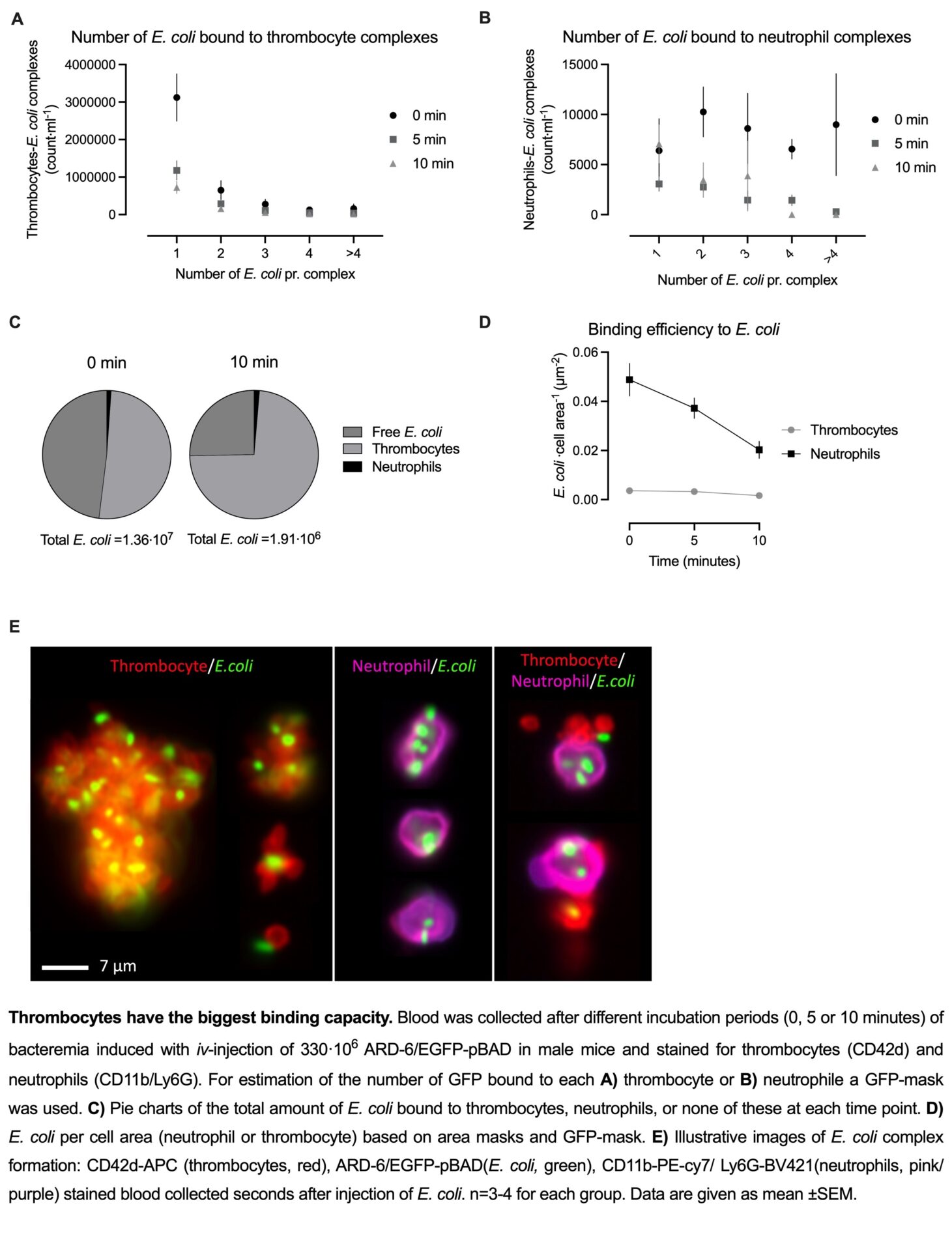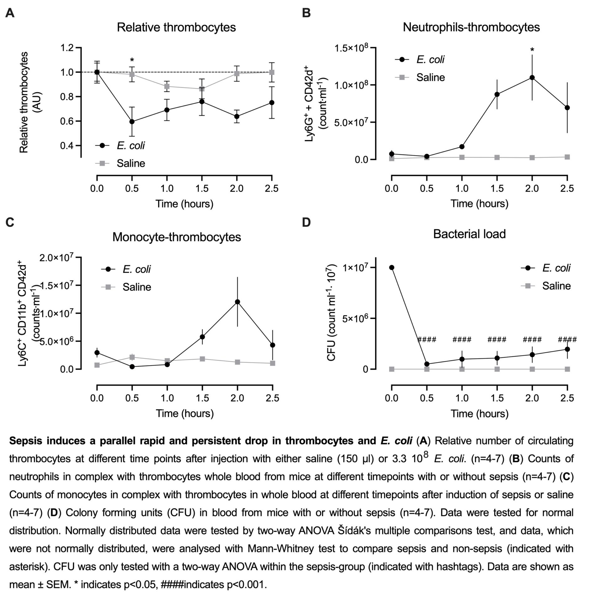 All experiments were carried out in male Balb/cJRj mice (8-10 weeks, 24.8 ± 0.2 g). Mice were anaesthetised for the entire experiment with ketamine/xylazine (100/10 mg kg-1) sc. A bolus of 330∙106 E. coli (O6:K13:H1) with or without eGFP-pBAD plasmid was administered through the tail vein. The number of circulating thrombocytes (CD42+), neutrophils (Ly6G+) and monocytes (Ly6C+/CD11b+) were determined by flow cytometry. Bacterial load was quantified as CFU on LB-agar plates or by flow cytometry (EGFP). The results are given as mean±S.E.M., and statistical significance was tested by two-way ANOVA in GraphPad Prism v10.2.1 Experiments were approved by the National Animal Experiment Expectorate, Denmark (2020-15-0201-00422).