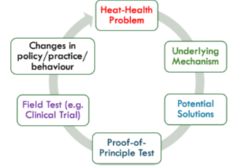 Drawing on our recent collaborative research evaluating scalable cooling strategies for workers in Bangladesh’s ready-made garment industry as an example, the cycle begins with systematically identifying and quantifying the heat-health problem. This initial phase is critical to ensure that resources are allocated to address issues with the most significant impact. Partnering with an RMG factory in Dhaka, we measured human heat stress potential by considering not only air temperature – as is common in meteorological and epidemiological studies – but also incorporating humidity, air movement, and mean radiant temperature, which collectively define the potential for physiological heat strain. Additionally, worker interviews were conducted to establish the presence experienced symptoms of heat illness or exhaustion, whose physiological mechanisms are well documented.