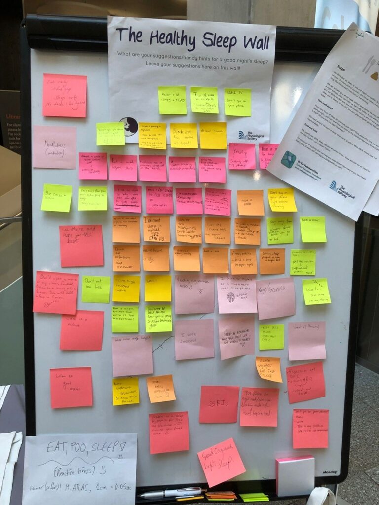 Figures 1&2 – Responses to the Healthy Sleep Wall activity and Eva-Mae and Dr Lydia Hanna stood in front of our Physiology Week event.