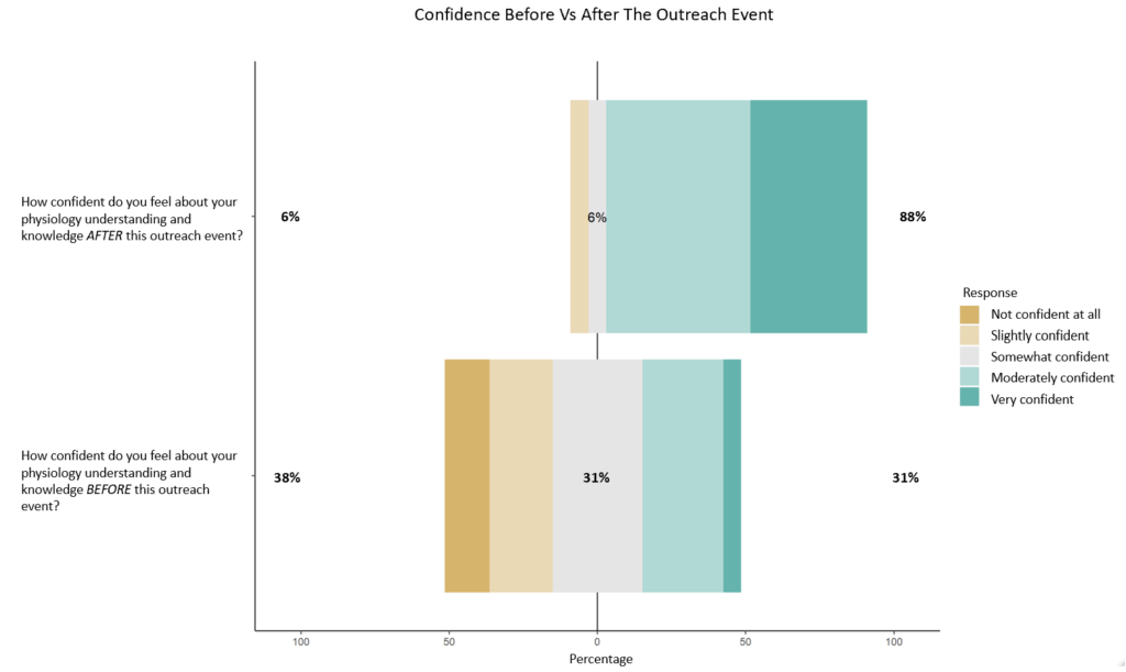 Figure 4 – The distribution of self-reported confidence levels regarding participants’ understanding and knowledge of physiology before and after the Physiology Week outreach event. Shows the percentage of respondents who selected each confidence level: “Not confident al all,” “Slightly confident”, “Somewhat confident”, “Moderately confident”, and “Very confident”.