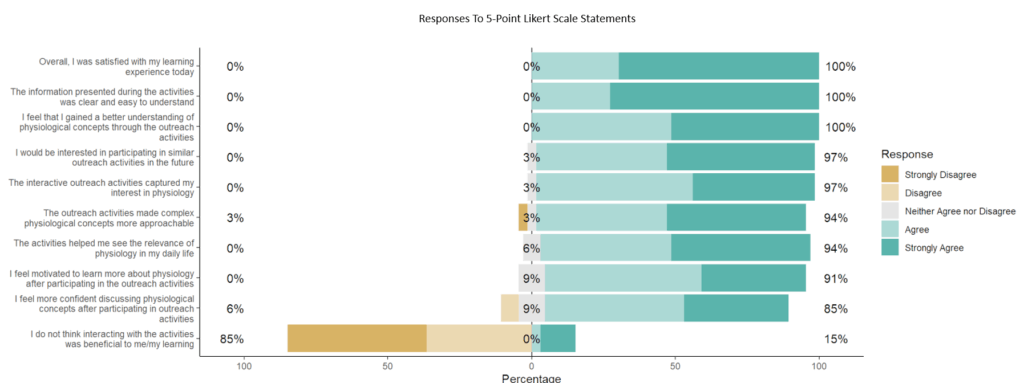 One of the most significant findings was that there was a clear increase in participants’ confidence in their understanding and knowledge of physiology after participants had taken part in the event, compared to before. This is a powerful indicator that even a short outreach activity can make a meaningful difference in how different people feel about science and their ability to understand it.