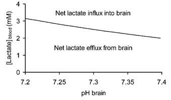 Figure 1. The relationship between brain pH and [Lactate]blood. At physiological brain pH (7.2) it is calculated that [Lactate]blood must rise to 3.2 mM in order for net transport of lactate into the brain to occur. However as the brain becomes more alkaline, this concentration decreases such that at brain pH = 7.4 (~ blood pH), [Lactate]blood must only exceed [Lactate]brain in order for net lactate transport into the brain to occur.