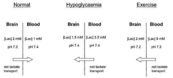 Figure 2. Net lactate transport under normal, hypoglycaemic or exercise conditions. Under normal conditions there is a net efflux of lactate from the brain, implying that the brain generates lactate from glucose and transports it into the venous circulation. Under hypoglycaemic conditions the alkalization of the brain reduces the threshold for net transport of lactate into the brain. It should be noted that this is an experimental paradigm in which exogenous lactate is applied to the systemic circulation. During exercise [lactate]blood rises considerably accompanied by an acidification of blood, facilitating net lactate transport into the brain.