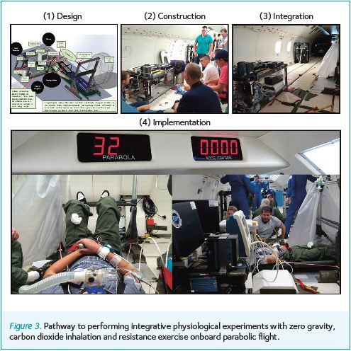 While we assessed the first question by asking participants to change posture from sitting upright to lying down while obtaining the relevant measurements, the two other questions required some thoughtful logistics and rehearsal. For example, the second question addressing the effects of protracted cephalad fluid shifts was assessed by placing participants on -6° head-down tilt bedrest for 24 hours to simulate microgravity (Fig. 2). Whereas the third question was much more elaborate, as the participants needed to be secured to avoid free floating during parabolic flight, but no pressure could be applied to the abdomen, as this is known to increase both central venous and intracranial pressures. Moreover, performing resistance exercise without the counter force of gravity is challenging. A typical flight campaign is flown over 4 – 5 consecutive days with one flight per day. Prior to flight, all research equipment needs to be stowed securely and once at a cruising altitude deployed, set-up and calibrated in under a few minutes. With the team at Wyle Laboratories, Inc, we built and set-up the necessary equipment (Fig. 3) and repeated the set-up protocol and measurement procedures in a mock environment for a week prior to each campaign. Staffing each flight typically involved one participant, a study director, an ultrasonographer, a research nurse, a neurosurgeon and a research engineer with a typical participant schedule as follows: