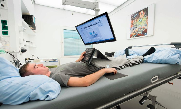Precise measurement of pressure within the human body requires the insertion of a catheter or needle into the fluid compartment of interest. So, measuring pressure inside the brain of healthy volunteers in microgravity is a real challenge! Fortuitously, Benjamin Levine recalled a group of patients from his days as a medical resident whom had an Ommaya reservoir (catheter placed from the lateral ventricle to a reservoir under the scalp) inserted for the delivery of prophylactic central nervous system chemotherapy as part of their treatment for haematologic malignancy. In many of these patients, the reservoir is left in place permanently, even after complete recovery. Intracranial pressure can therefore be measured by placing a small butterfly needle into the reservoir while sutured securely to allow free movement and accurate recordings. For our study we recruited five men and three women with Ommaya reservoirs, and combined measurements of intracranial pressure with central venous and arterial blood pressures, measured at the level of the right atrium of the heart via catheterisation of the brachial vein and determined by non-invasive finger artery photoplethysmography and brachial artery electronic sphygmomanometry, respectively (Fig. 1).