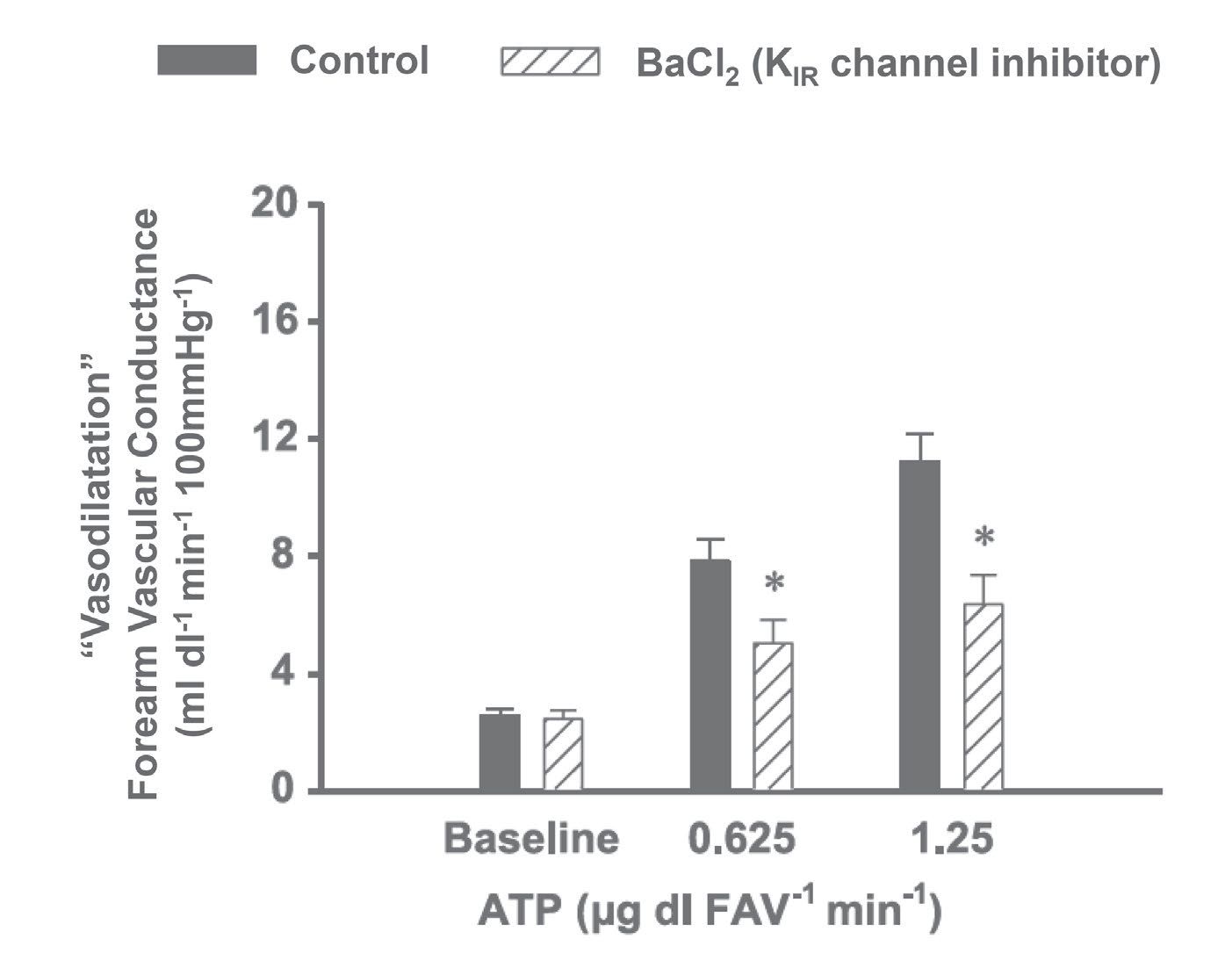 It was necessary to first establish our ability to sufficiently inhibit a hyperpolarizing stimulus (exogenous KCl) with the combination of BaCl2 and ouabain, as had previously been described (Dawes et al. 2002). With these control experiments completed (in fairly profound fashion as we essentially eliminated any K+-mediated vasodilatation), we began our first experiments to test the impact of inhibition of KIR channels and Na+/K+-ATPase on ATP-mediated vasodilatation (Crecelius et al. 2012). These first studies were some of the more exciting in the laboratory to date. Given our data are collected in real-time, we were able to immediately estimate the changes in muscle blood flow following inhibition. From the first subject forward, it was clear these inhibitors were more ‘powerful’ than those we had used before and a large portion of ATP-mediated vasodilatation was explained by these pathways. After a number of experimental approaches, we determined the primary mechanism of ATP-mediated vasodilatation is vascular hyperpolarization via activation of KIR channels (Fig. 3) (Crecelius et al. 2012).