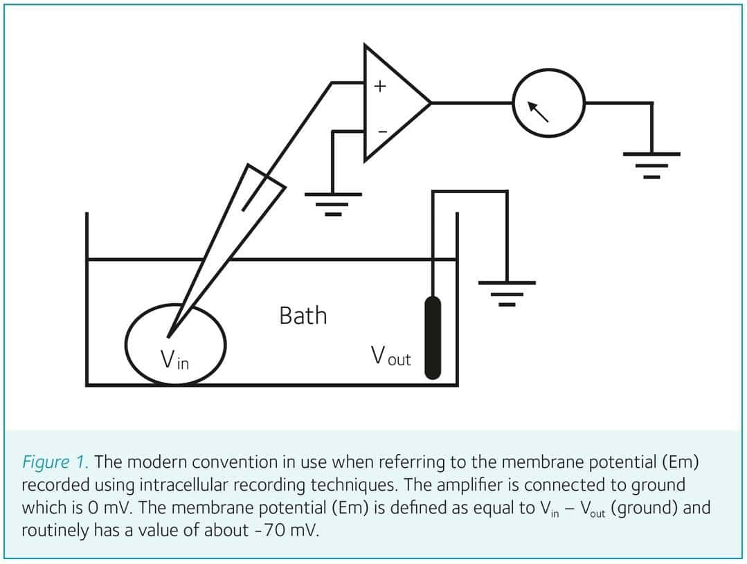 Modern practice deviates from this convention, showing inward current as a downward deflection and membrane potential as “positive-up, negative-down” (Patton, 1982). The modern convention is illustrated in Fig. 1, where an electrode is shown inserted into a cell submerged in a bath, the amplifier is grounded (0 mV), and a resting membrane potential of about -70 mV is recorded, leading to the classic physiology teacher’s formulation where, if the membrane potential (Em) moves towards 0 mV this is considered a depolarisation (a decrease in polarisation), a move towards the resting potential is considered a repolarisation, and a move to a potential more negative than the resting potential is considered a hyperpolarisation (an increase in polarisation; Hille, 2001).