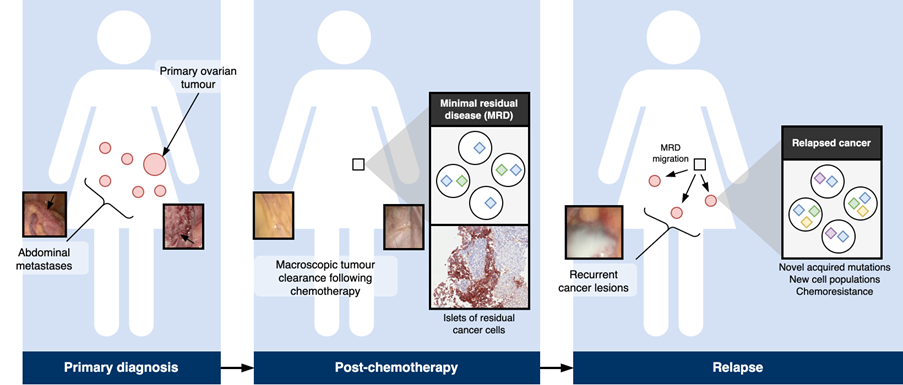 High-resolution studies of post-operative tissues reveal that microscopic deposits of ovarian cancer cells (minimal residual disease, MRD) can remain after surgery and chemotherapy (Hellner et al., 2016). These residual cells are the seeds by which the cancer cell population can repopulate and, having already survived a course of treatment, they are likely to be resistant to further applications of the same treatments (Fig.1).