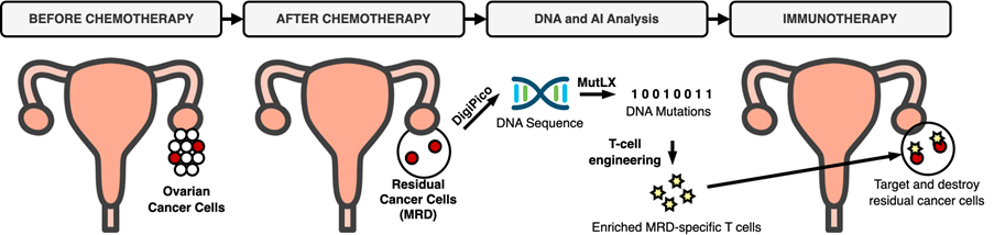 Mutations carried by cancer cells appear foreign to our immune system, which reacts by initiating a T-cell response to eliminate the cancer. However, if the immune system is persistently unable to clear the cancer, T-cell exhaustion can occur, in which the immune system switches from attacking the cancer to co-existing with it and T-cells become underactive. Boosting the cancer-specific T-cell response through adoptive T-cell therapy is an obvious approach to addressing this issue. Using DigiPico and MutLX, we can now sequence and identify mutations specific to residual cancer cells, and therefore identify the corresponding cancer-specific T-cell subpopulation. By expanding and enriching this subpopulation in the laboratory and then reimplanting these T-cells into the patient, the hope is that the residual cancer could be fully eradicated, preventing relapse. Importantly, by intervening at the MRD stage, the disease can be tackled before further cancer evolution takes place, which might alter the properties of the disease.