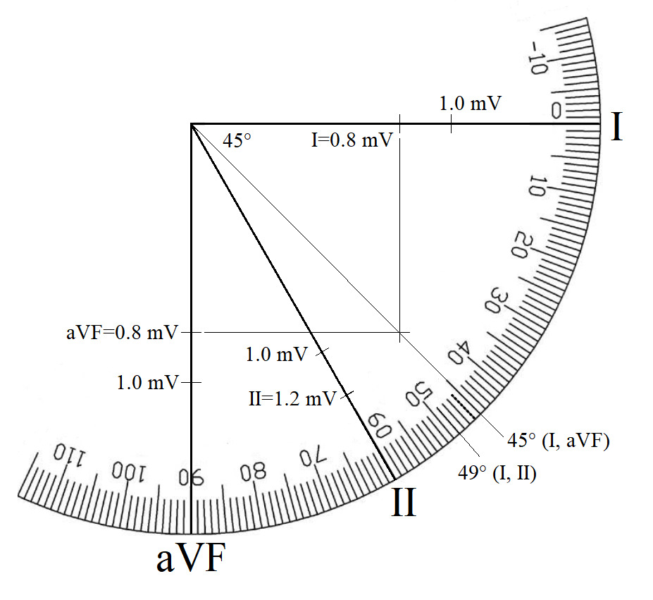 With the permission of Dahl and Berg, we modified their original figure (Dahl and Berg, 2020) and used their sample of a normal ECG. For the purpose of this publication we are using only the right-down quadrant. They estimated the value of lead I as 0.8 mV and the value of the aVF as 0.8 mV. Correspondingly, the value of the lead II is 1.2 mV. Fig. 1 shows a graphical representation provided by Dahl and Berg of the EA as estimated from a combination of leads I and II. Fig. 2 shows a graphical representation of the EA as estimated from leads I and aVF without correction of the lead aVF. Fig. 3 (the visualisation of the ‘Novosel Formula’) shows a graphical representation of the EA as estimated from a combination of leads I and II (as shown in Fig. 1) plus a combination of leads I and the recalculated value of aVF (Novosel et al., 1999; the recalculated aVF = 2*aVF/√3).