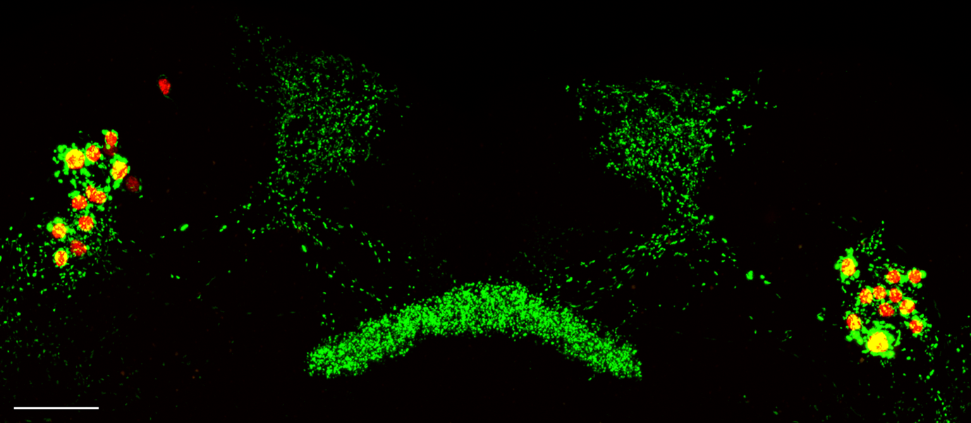 Dorsal fan-shaped body neurons (dFBNs), labelled by R23E10-GAL4, expressing a mitochondrially-targeted GFP (green) and the cell nuclei marker RedStinger (red). Cellular processes departing from the somata arborise in two hemispheric dendritic tufts and converge centrally to innervate the dorsal layers of the fan-shaped body. Scale bar = 25 μm
